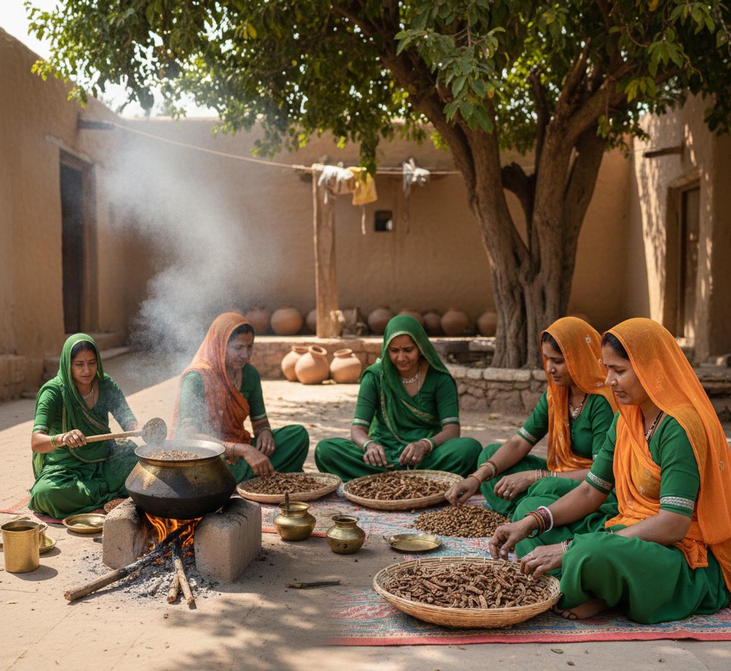 SHG women play a crucial role in preparing Deekri’s ingredients: ● Hand-sorting Sangri, Ker, Kumat, and Gunda ● Removing impurities with careful inspection ● Cleaning and grading raw produce ● Preserving traditional handling methods